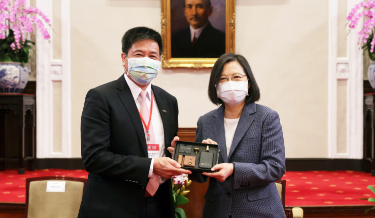 友達在「國家企業(yè)環(huán)保獎」中獲雙項「金級獎」肯定,董事長彭雙浪(左)代表接受總統(tǒng)蔡英文表揚
